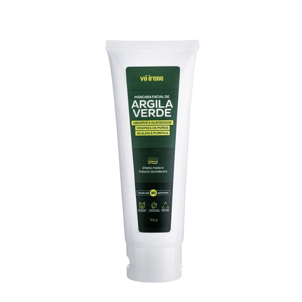 A Máscara Facial de Argila Verde Vó Irene reúne Argila Verde, Alantoína e Lactato de Mentila em uma fórmula purificante que ajuda a controlar a oleosidade e a reduzir a aparência dos poros sem ressecar.